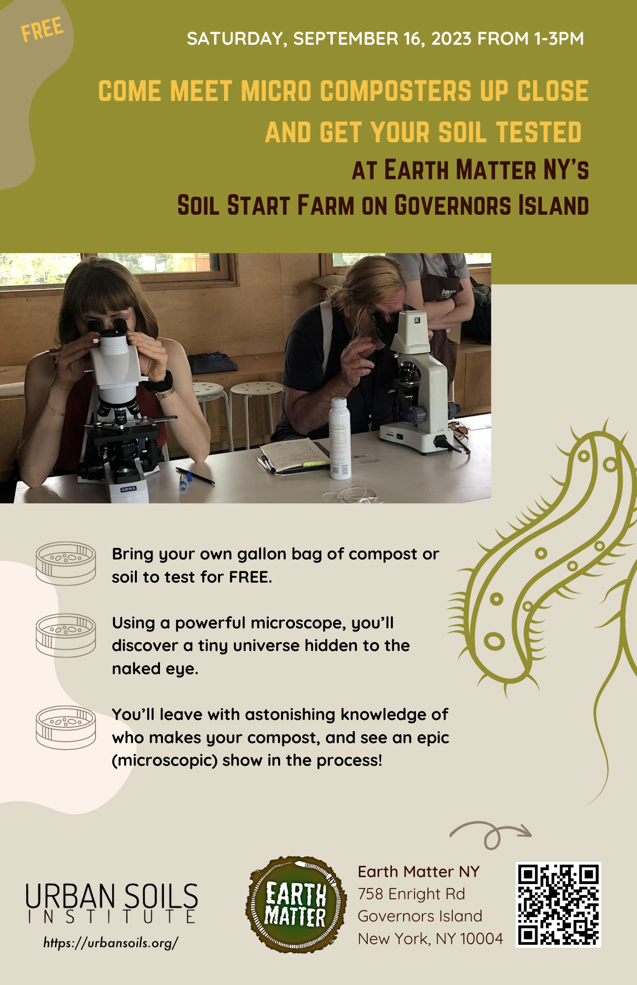 Join the NYC Urban Soils Institute and Earth Matter NY for a Free Soils Testing and Soils Microscopy Workshop at Soil Start Farm on Governors Island! Bring soil from your home or garden and we'll test it for heavy metals content. Stick around and discover the incredible microbiome of compost and soil using our powerful microscopes and prepared slides. All ages are welcome!